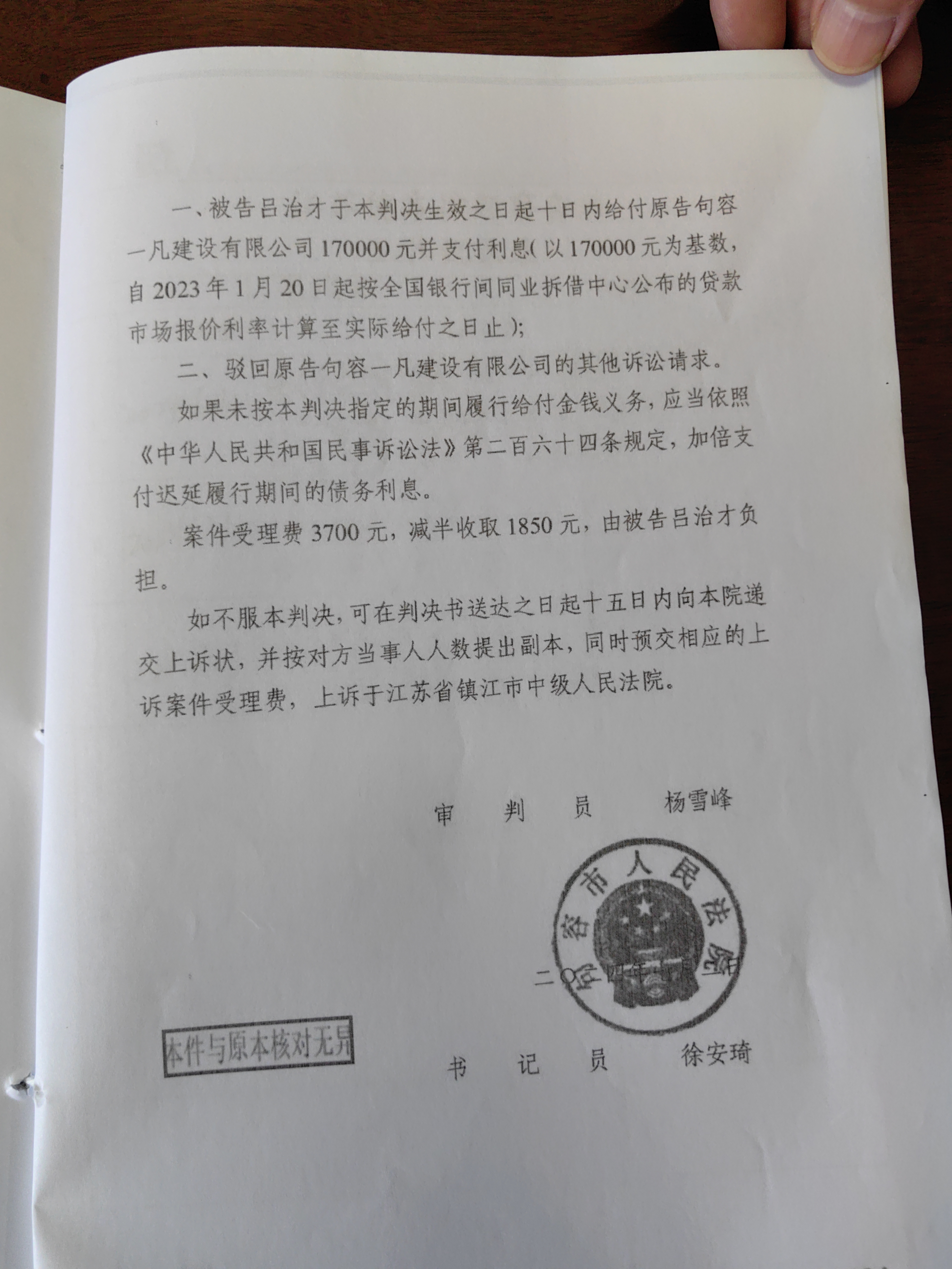 依照相关法律规定,法院作出判决:一、被告吕某某于判决生效后十日内给付原告句容某某建设有限公司挖机款17万元及相应利息(以17万元为基数,自2023年1月20日起按全国银行间同业拆借中心公布的贷款市场报价利率计算至实际给付之日止);二、驳回原告的其他诉讼请求;案件受理费减半收取1850元,由被告吕某某负担。