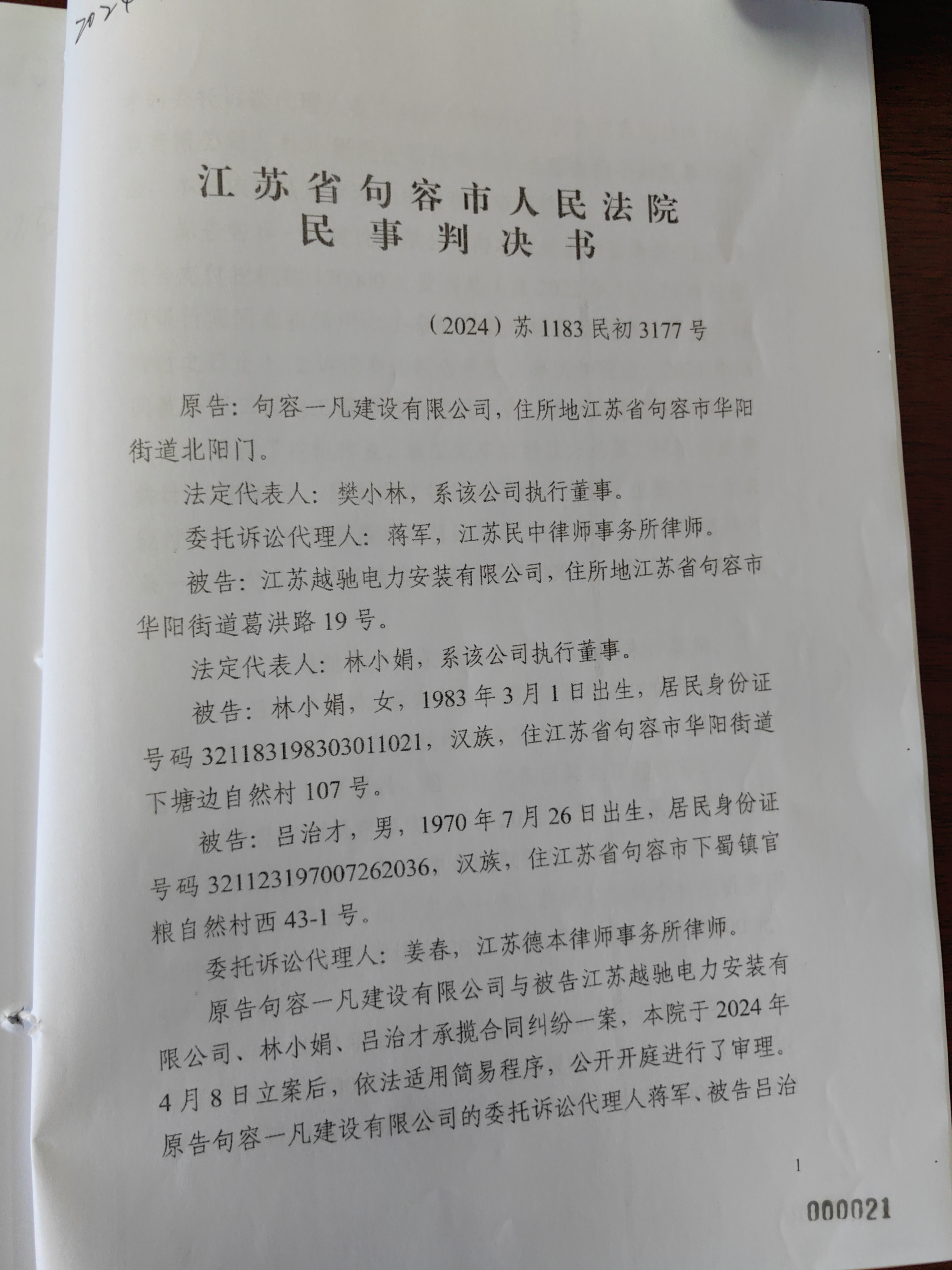 原告句容某某建设有限公司因承揽合同纠纷,将被告江苏某某电力安装有限公司、林某某、吕某某诉至江苏省句容市人民法院,被告吕某某委托江苏德本律师事务所姜律师担任委托诉讼代理人。本案于2024年4月8日立案,法院适用简易程序公开开庭审理,原告委托诉讼代理人、被告吕某某及委托诉讼代理人均到庭参加诉讼,其余二被告经传票传唤无正当理由拒不到庭,法院依法缺席审理。