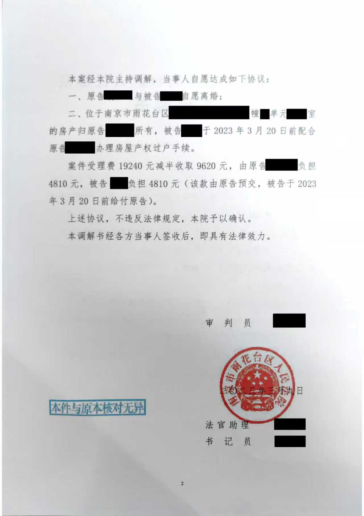 案件结果本律师接受委托后,协助张女士办理了公证委托手续,并顺利在法院立案,后经与法官沟通,法院同意张女士和王先生可以线上参加庭审,经过本律师和法官对双方的沟通调解,最终张女士与王先生达成调解,王先生配合张女士办理房产过户手续,拿到法院调解书后,本律师继续协助张女士委托其父亲,前往不动产登记中心,顺利办理了过户手续。