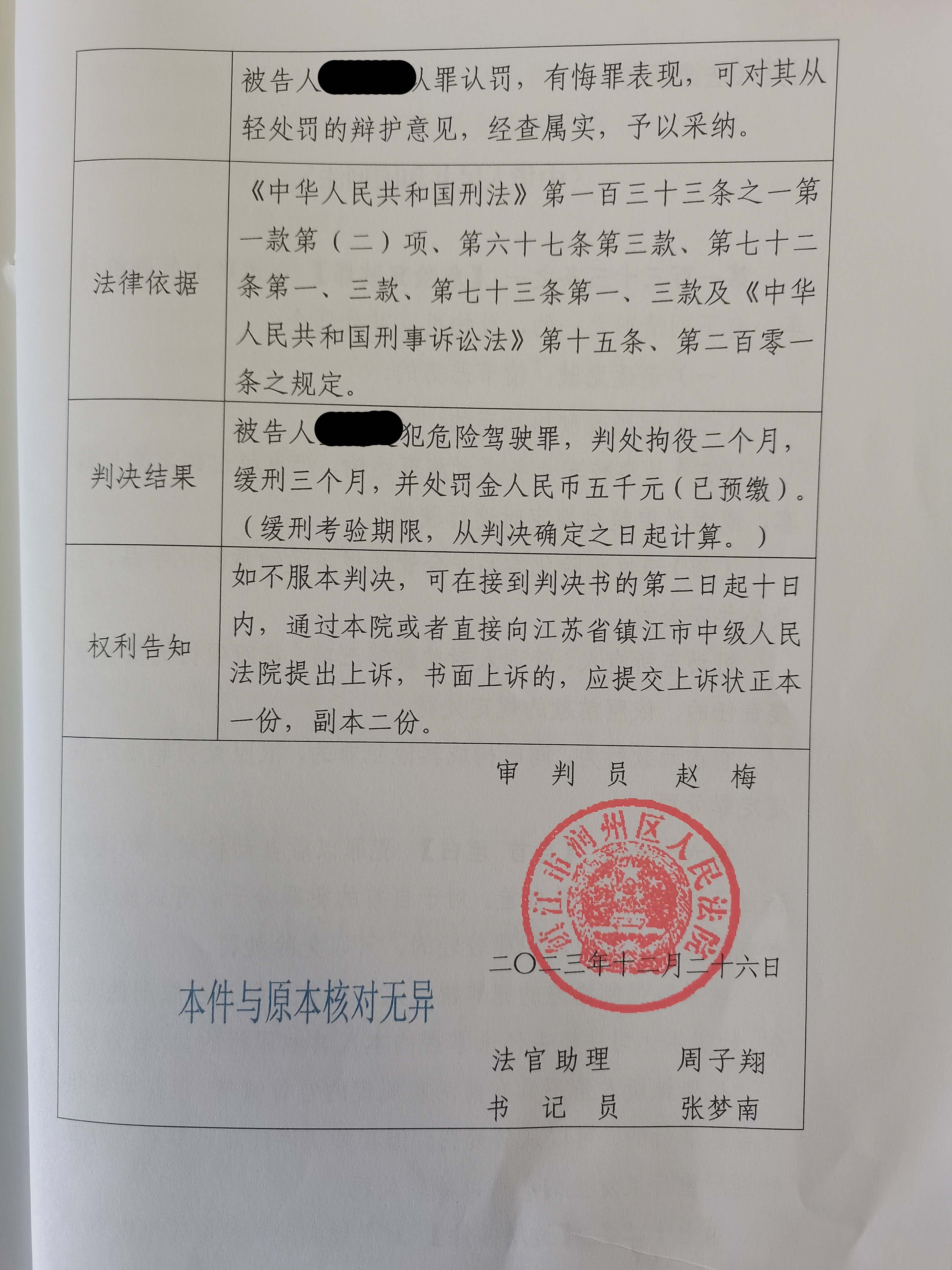张某酒后驾车,被交警拦住后,试图逃避酒精测试,被拘留逮捕。本律师担任辩护人后,申请重新鉴定,成功使张某判缓刑,免于牢狱之灾。(附图)