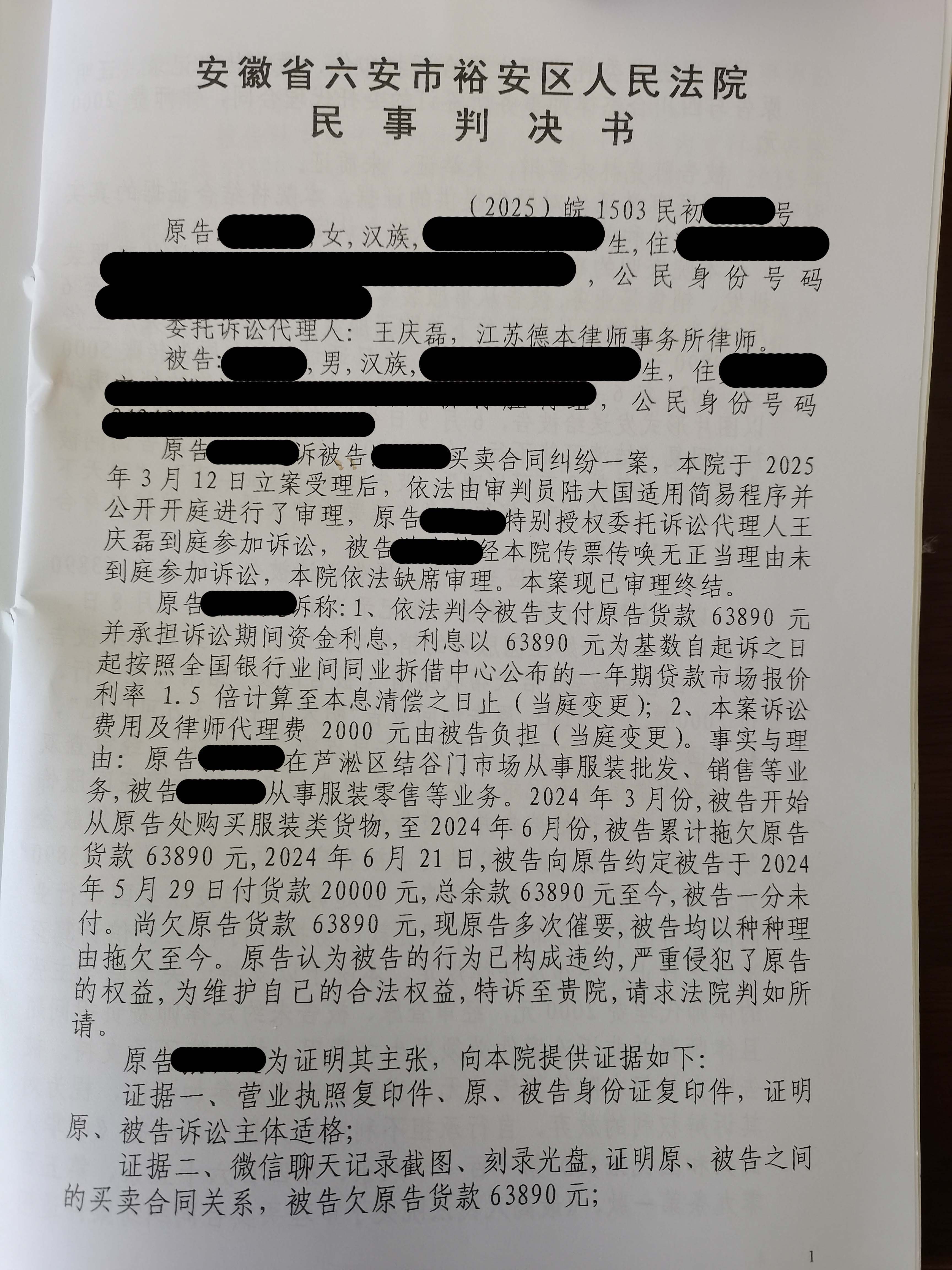 某服装店经营者张某与客户陈某因货款纠纷诉至法院,本律师代理张某成功拿回货款十万元。(附图)