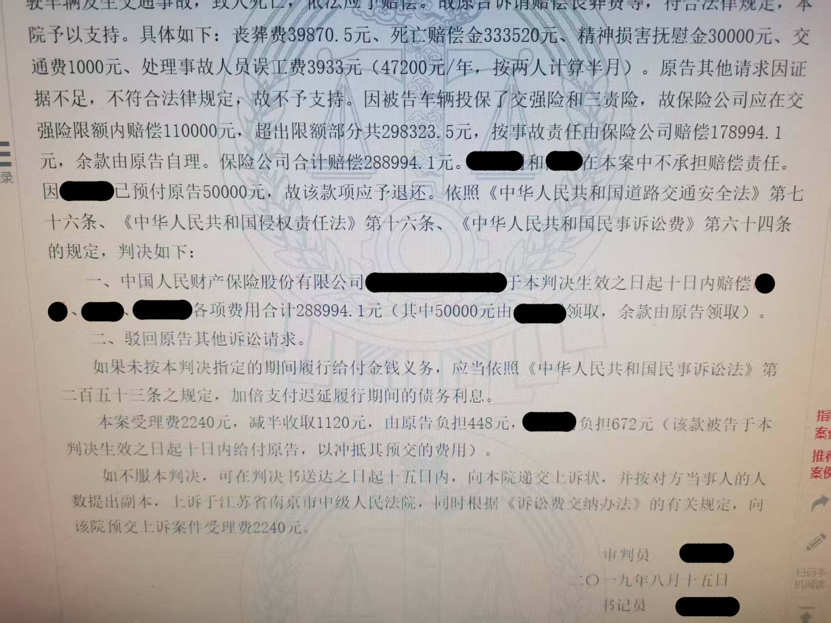 具体如下:丧葬费39870.5元、死亡赔偿金333520元、精神损害抚慰金30000元、交通费1000元、处理事故人员误工费3933元。因被告车辆投保了交强险和三责险,故保险公司在交强险限额内赔偿110000元,超出限额部分共298323.5元,按事故责任由保险公司赔偿178994.1元,余款由原告自理。保险公司合计赔偿288994.1元,家属对此结果非常满意。