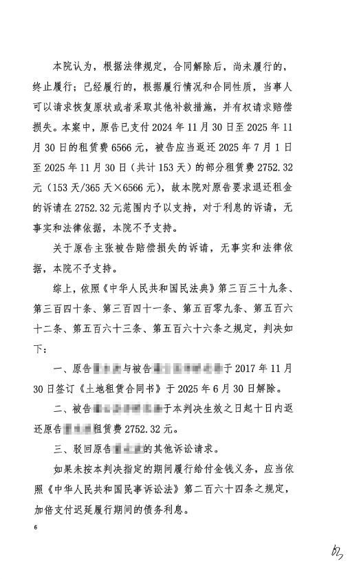 法院经审理认为,被告虽非案涉土地所有权人,但具备对土地的控制支配能力,且已实际将土地交付原告,原告在未取得许可的情况下计划建设厂房被阻,并非被告违约所致;原告虽无主张解除合同的法定情形,但被告庭审中同意解除合同,法院予以认可,酌定合同于2025年6月30日(被告收到起诉状副本之日)解除。关于租金退还,法院判令被告返还原告2025年7月1日至11月30日的租赁费2752.32元,驳回原告利息主张;原告主张的损失赔偿无事实和法律依据,法院不予支持。案件受理费3070元,由原告负担3000元,被告负担70元。
