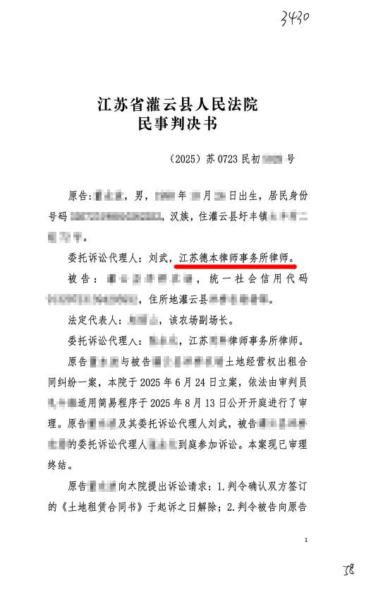 争议焦点展开充分举证与辩论。刘律师向法院提交土地租赁合同、付款凭证、相关生效判决书等关键证据,充分证明案涉土地存在权属争议,被告未向原告交付无权利瑕疵的租赁土地,且原告因权属问题无法实际使用土地,合同目的已无法实现,原告依法享有合同解除权,被告应承担违约赔偿责任并退还相应租金。针对被告提出的原告擅自改变土地使用性质的抗辩,刘律师亦结合案件事实作出精准回应,厘清案件责任划分,展现出严谨的法律思维和出色的庭审应对能力。