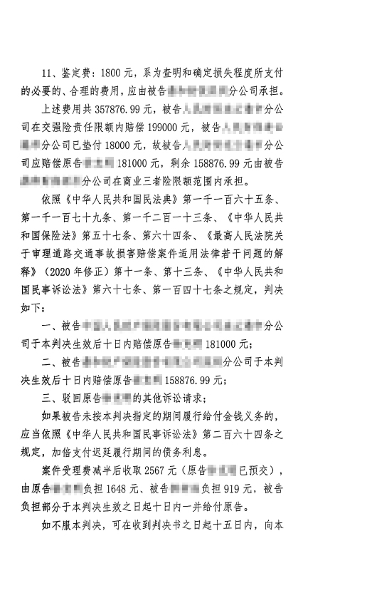法院依法判决:被告人民某某保险连云港市分公司赔偿原告181000元;被告鼎和某某保险深圳分公司赔偿原告158876.99元;驳回原告其他诉讼请求;案件受理费2567元,由原告负担1648元,被告韩某某负担919元。