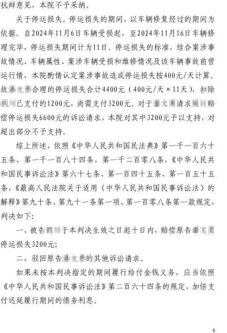 法院经审理认定,被告负事故全部责任,应赔偿原告合理的停运损失;结合转账时间、后续维修费沟通等事实,推定被告支付的1200元为停运损失,但现有证据无法证明双方就停运损失达成一次性处理的约定,被告应承担举证不能的不利后果。法院结合车辆属性、维修时长及营运实际,酌情认定停运损失按400元/天计算,11天合计4400元,扣除已支付的1200元,被告还需赔偿3200元,对原告超出部分的诉请不予支持。