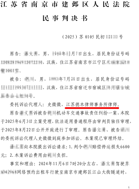 2024年11月6日,被告驾驶小型汽车在南京市建邺区江山大街隧道追尾原告驾驶的网约出租车,致原告车辆受损,交管部门认定被告负事故全部责任。原告车辆当日送修,11月16日维修完毕,产生维修费8000元(被告及保险公司已付清),原告主张车辆停运11天造成损失6600元,诉请被告予以赔偿。被告辩称事故当日支付的1200元系停运损失,双方就该事宜已处理完毕,无需再赔偿,江苏德本律师事务所律师团队接受委托后,结合案件事实与证据,为被告制定专业抗辩策略,全力维护当事人合法权益。
